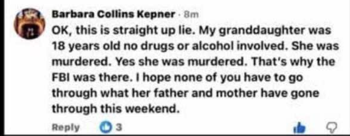 “OK, this is straight up lie. My granddaughter was 18 years old no drugs or alcohol involved. She was murdered. Yes she was murdered. That is why the FBI was there. I hope none of you have to go through what her father and mother have gone through this weekend.”