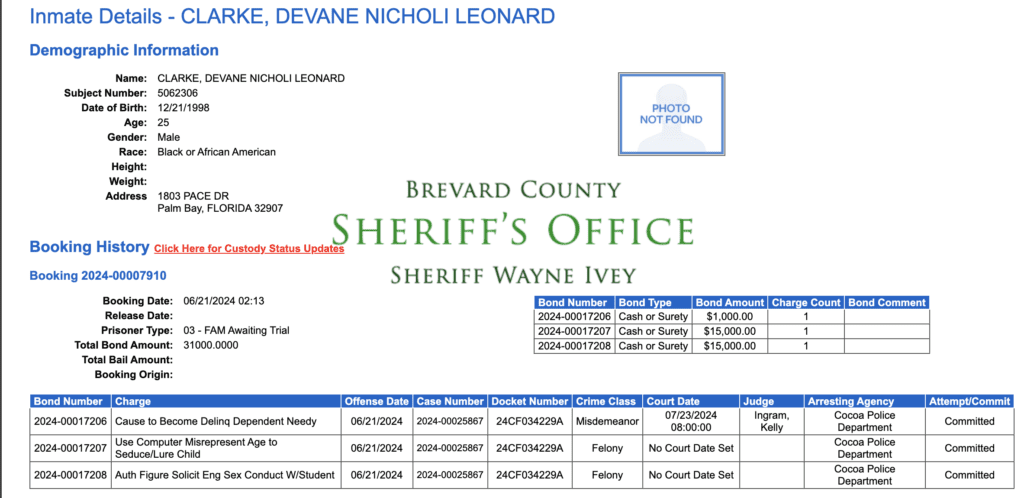 Cocoa, FL – On June 20, 2024, the Cocoa Police Department responded to a concerning incident involving Devane Nicholi Lonard Clarke, the newly appointed Assistant Principal at Cambridge Elementary School. Clarke, who was recently reclassified from his teaching position to Assistant Principal effective August 2, 2024, has been arrested on charges of inappropriate communication with a minor, a former student. He’s also the President of the Palm Bay West Little League.