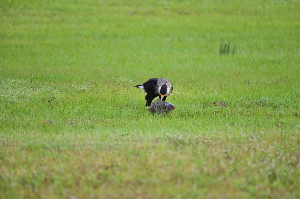 The ensuing struggle ended with a surprising turn of events, as the crested caracara emerged victorious, securing its prize in a nearby field.