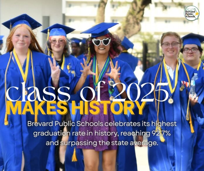 VIERA, Fla. — Brevard Public Schools says it has reached the highest graduation rate in district history, reporting a 92.7% high school graduation rate for the 2024-2025 school year based on data released by the Florida Department of Education.