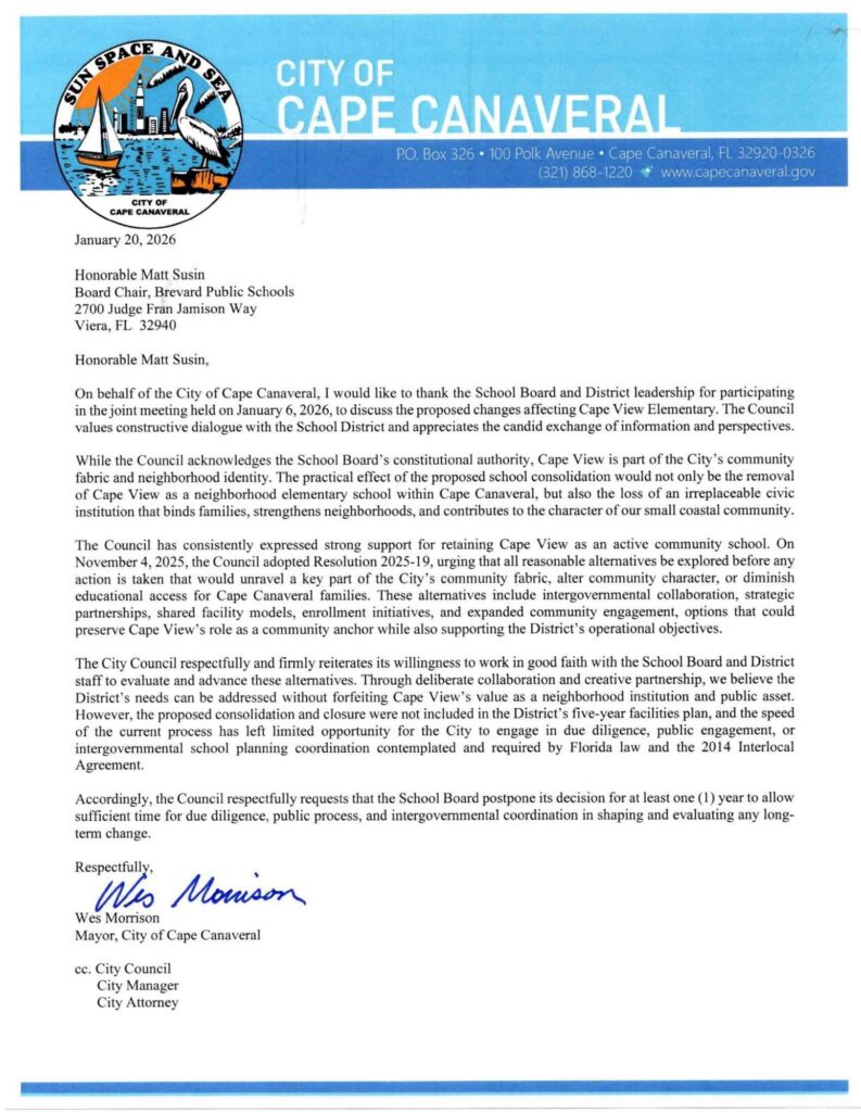 “The practical effect of the proposed school consolidation would not only be the removal of Cape View as a neighborhood elementary school within Cape Canaveral, but also the loss of an irreplaceable civic institution that binds families, strengthens neighborhoods, and contributes to the character of our small coastal community,” Morrison wrote.