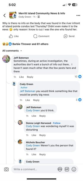 A post went viral in a Merritt Island Facebook group about concerned citizens discussing an apparent “decapitated woman” pulled from the water by Island Pointe condos. Cody Green, the person who made the initial post is apparently a maintenance worker for the condos according to him, and he’s the one who discovered the “body.”