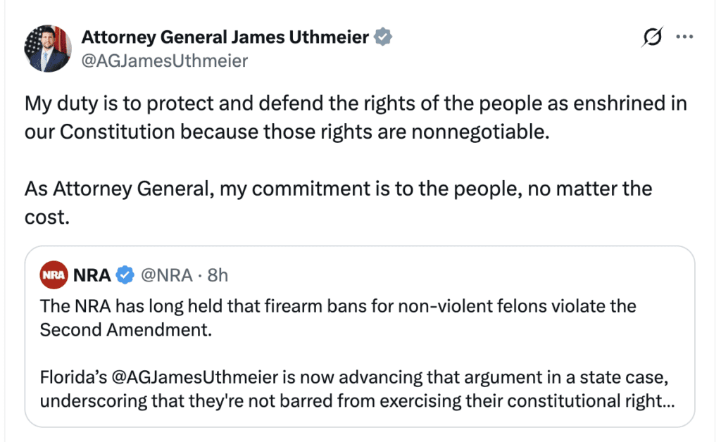 That opposition sharpened Friday when the Florida Prosecuting Attorneys Association filed a brief against Uthmeier’s position. According to News From The States, the prosecutors told the court that bans on firearm possession by convicted felons are consistent with the nation’s historical tradition and warned that recognizing a special category of “non-dangerous felons” would create uncertainty, confusion, and inconsistent enforcement. The group also argued that, from a constitutional perspective, all felons are dangerous felons, directly rejecting Uthmeier’s attempt to divide past offenders into dangerous and non-dangerous camps.