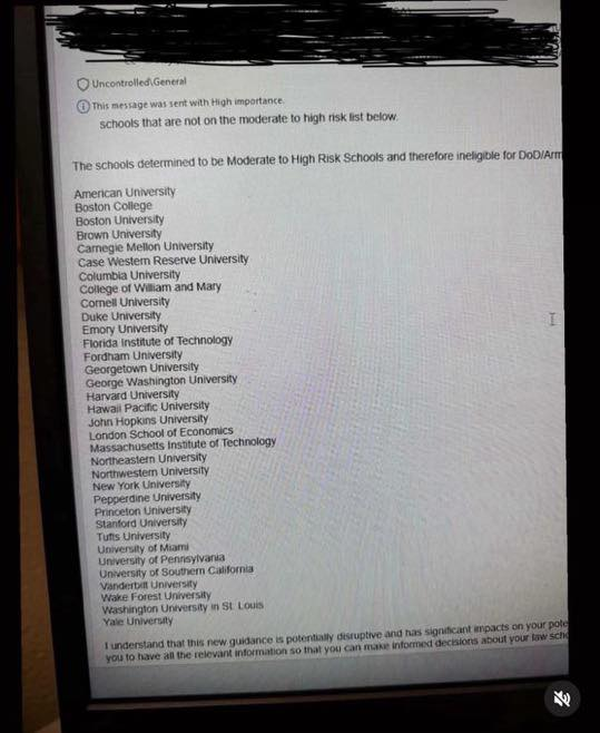 According to national reporting, the list was compiled by the Army in the wake of new guidance and was described as affecting troops who plan to enroll in graduate programs, including law school pathways. The reporting notes that the terminology being used is broad and has created confusion about exactly which programs are covered and how the “risk” label is being applied.