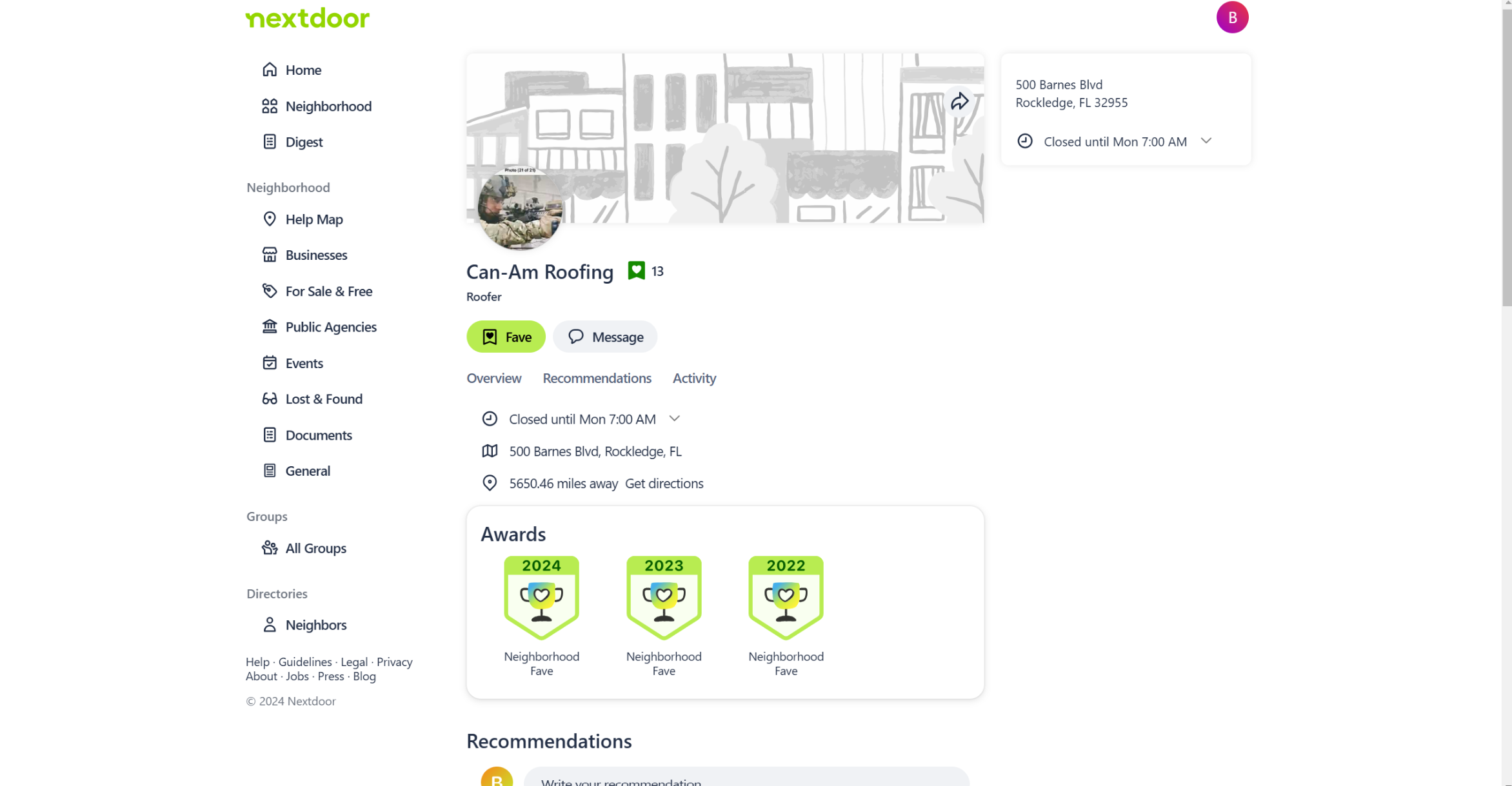 Farmer's Nextdoor profile — used to build community trust while maintaining the military persona