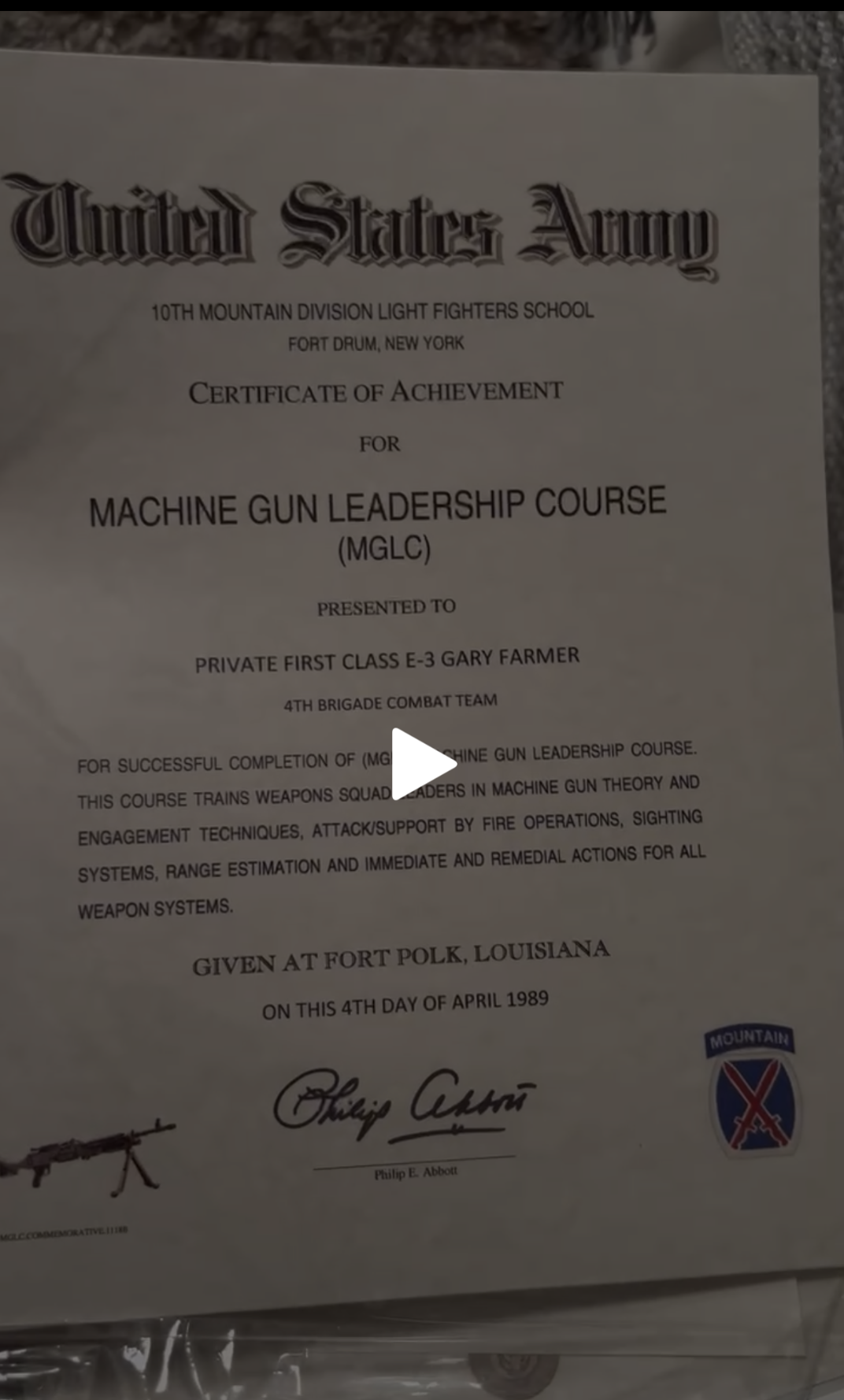Apr 4, 1989 Machine Gun Leadership Course (MGLC) — 10th Mountain Division E-3 (PFC) Header says “Fort Drum, NY” (10th Mountain’s home) but certificate is “given at Fort Polk, LA.” The 10th Mountain Division has never been based at Fort Polk. Geographic contradiction on the face of the document.