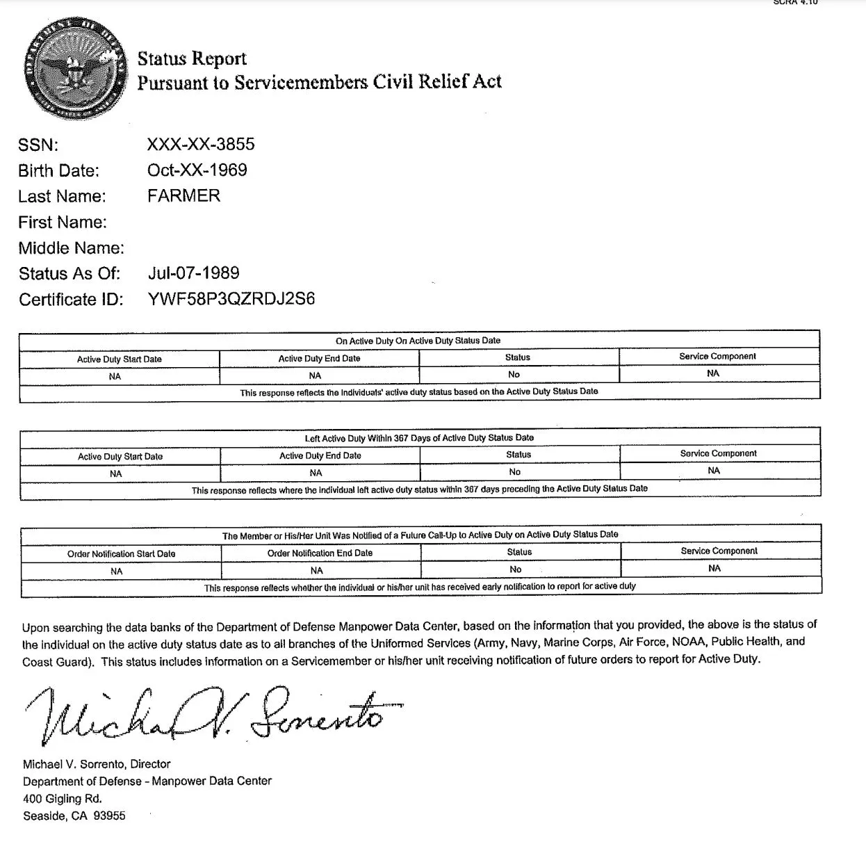 A SCRA Status Report was obtained for Gary A. Farmer, date of birth October 1969, partial SSN ending in 3855, with a status date of July 7, 1989 — right in the middle of the period when his fake certificates claim he was actively serving in the Army. The DMDC searched all branches of the uniformed services: Army, Navy, Marine Corps, Air Force, NOAA, Public Health Service, and Coast Guard. The results, signed by DMDC Director Michael V. Sorrento, are unambiguous: