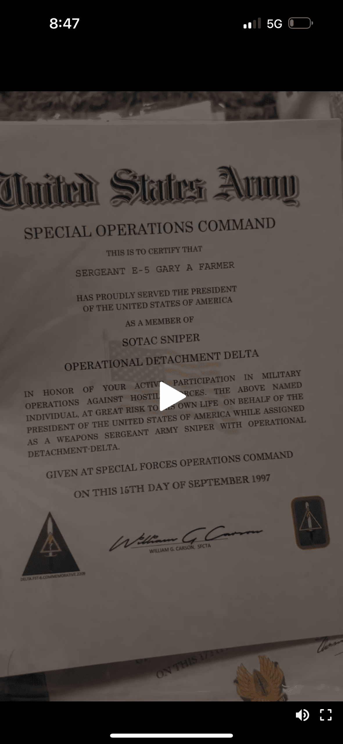 Sep 15, 1997 “SOTAC Sniper” — Operational Detachment Delta E-5 (SGT) — rank regression “SOTAC” is a misspelling. The real course is SOTIC (Special Operations Target Interdiction Course). The error appears verbatim on commercial replica sites. Delta Force does not issue public certificates naming membership. Signer “William G. Carson, SFCTA” is unverified. Rank regresses from 1989’s E-5.