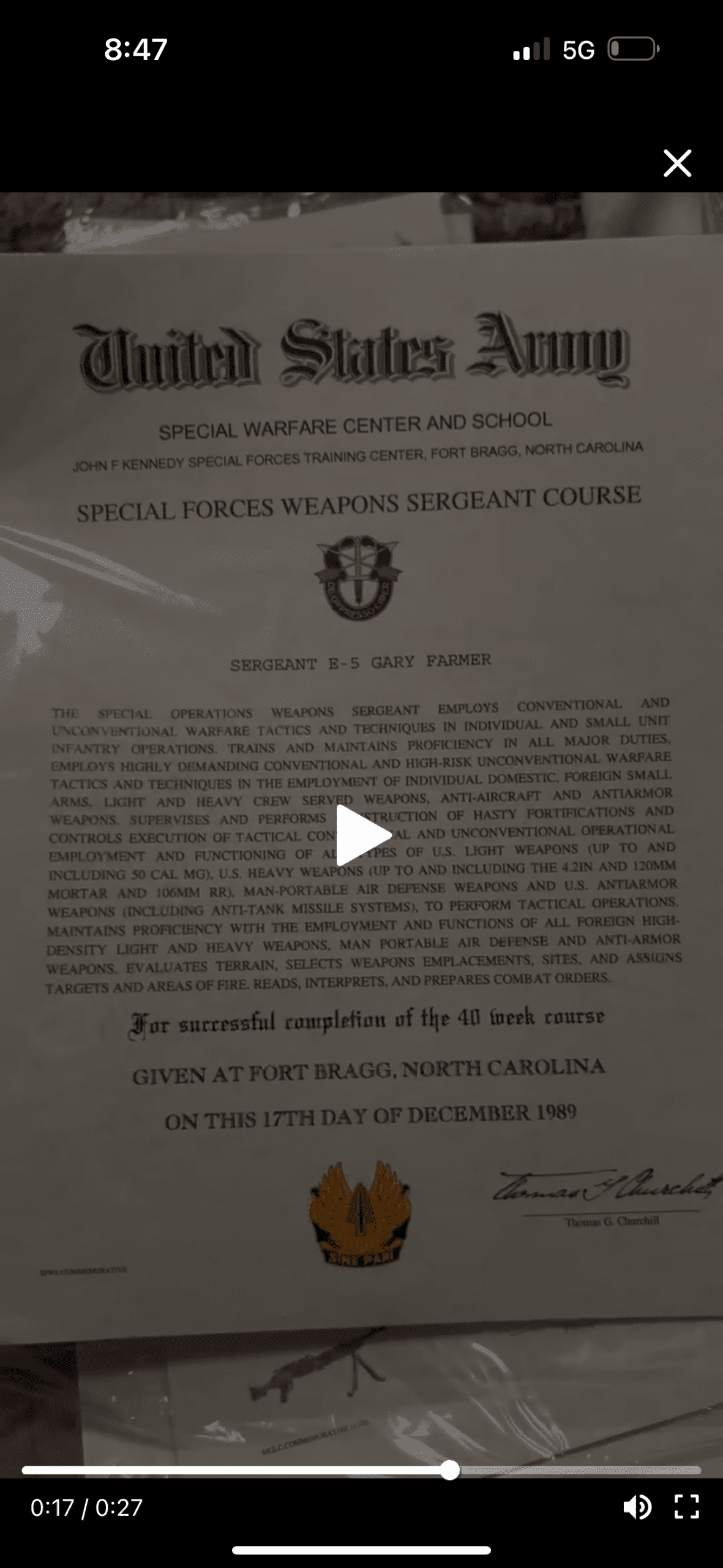 Dec 17, 1989 Special Forces Weapons Sergeant Course (40-week) — JFK Special Warfare Center, Fort Bragg Suddenly E-5 (SGT) Jumped from E-3 to E-5 in under 9 months — Army minimums require years. Real SF Qualification Course documented via DA Form 1059, not decorative diplomas. Signer “Thomas G. Churchill” is not any known JFK SWC commander.