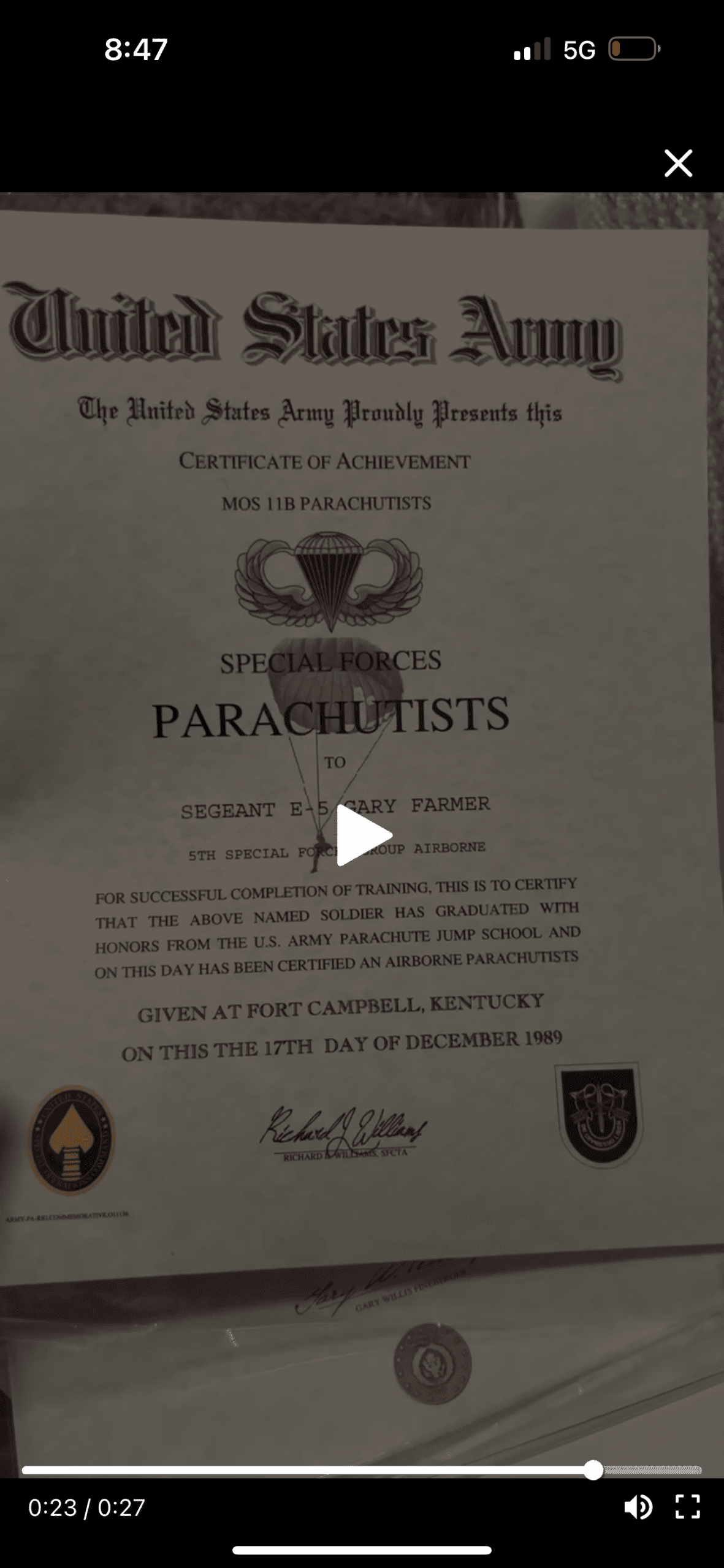 Dec 17, 1989 Airborne Jump School — Parachutist Certification, 5th SFG (A) E-5 (SGT) Same date as the Weapons Sergeant Course above. He allegedly finished two separate, lengthy military schools on the exact same day. Airborne School is at Fort Benning, GA — not Fort Campbell, KY (where this is listed). Signer “Richard J. Williams, SFCTA” is unverified.