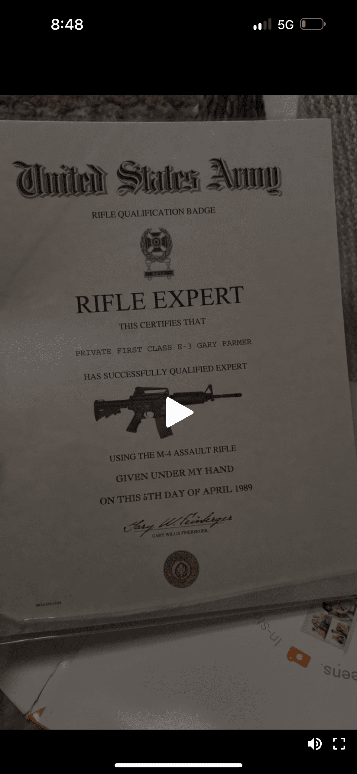 The M-4 carbine was not introduced to U.S. Army service until the mid-1990s. It did not exist as a standard-issue Army weapon in 1989. Soldiers qualify on the M16A1 or M16A2 rifle. Claiming to have qualified expert on the M-4 in 1989 is the equivalent of claiming you drove a Toyota Prius (he actually drives a Prius) in 1950. It is an anachronism so stark that it proves, on its face, that the certificate was created years later by someone who didn’t know (or didn’t bother to check) what weapons the Army actually used in the late 1980s (even into the 2000’s).