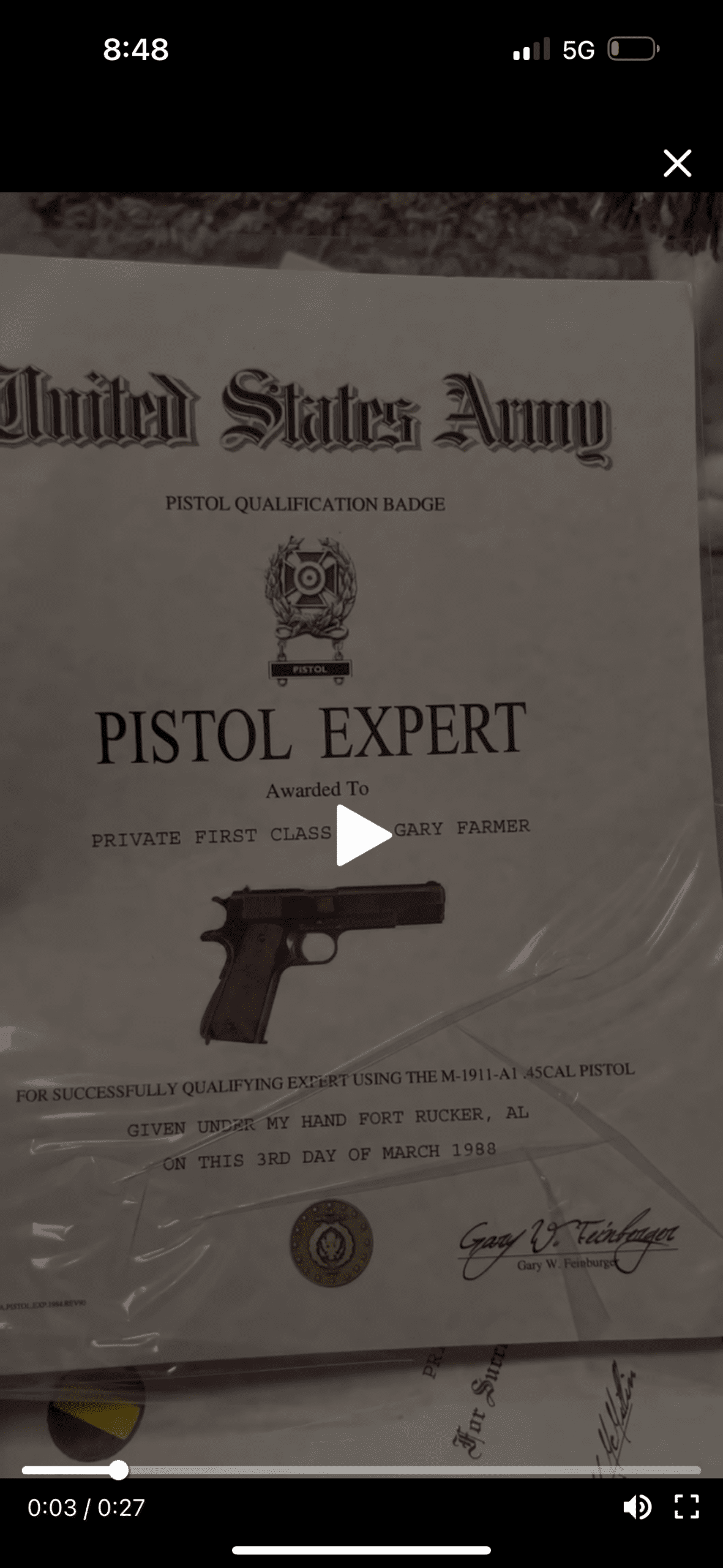 Mar 3, 1988 Pistol Expert — M-1911-A1 .45cal, Fort Rucker, AL E-3 (PFC) Same novelty template; marksmanship recorded via scorecards/DD 214, not framed diplomas. Signer “Gary W. Feinberger” matches no Army records.