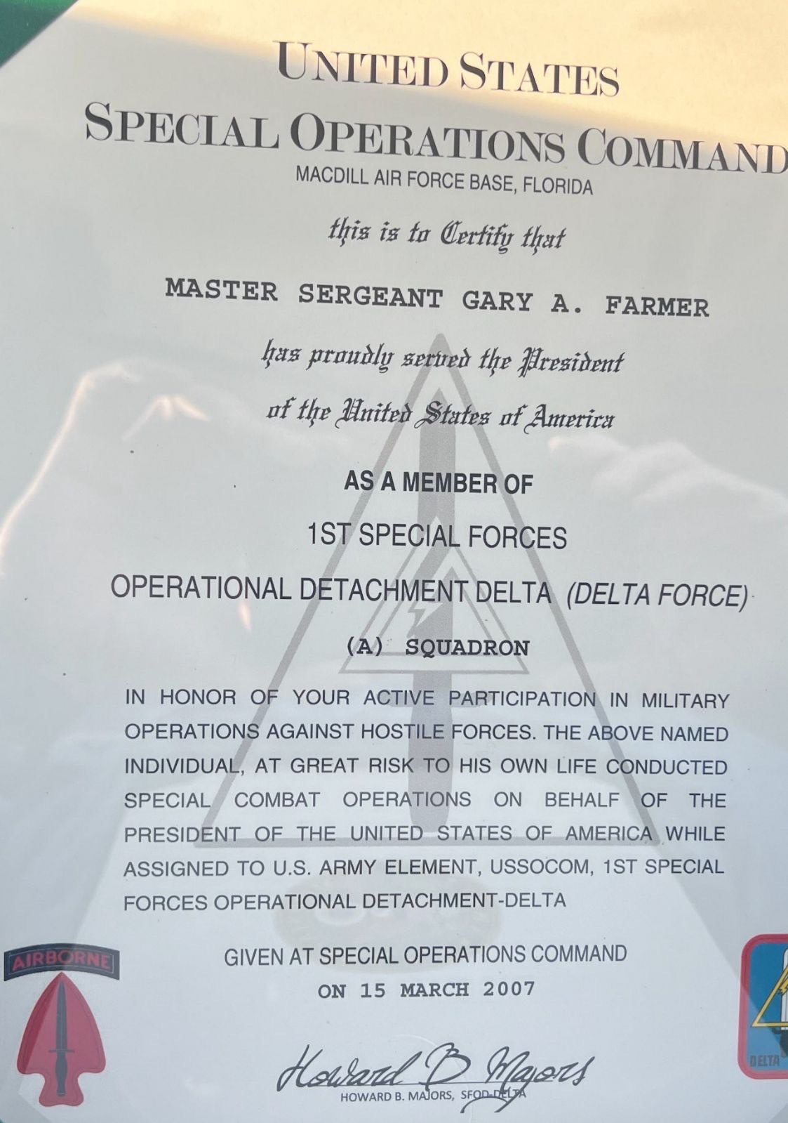 Mar 15, 2007 Delta Force Service — 1st SFOD-D, A Squadron, “serving the President” E-8 (MSG) USSOCOM at MacDill AFB does not issue individual service certificates like this. Phrasing (“served the President of the United States”) is theatrical — matches templates on eBay/novelty sites. Signer “Howard B. Majors” is no known USSOCOM commander.