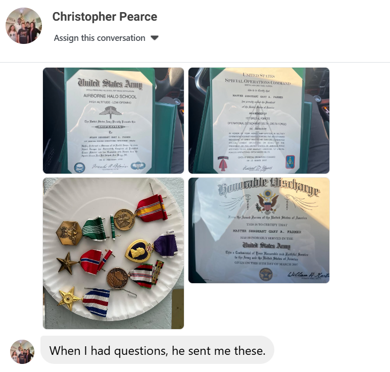 Multiple family members and former associates have reported that Farmer’s military claims were never consistent with anything they observed in his life. He has never discussed specific deployments, unit designations, or training experiences in the way that actual veterans do. He has never been able to name fellow operators or describe mission environments. Former partners report that when pressed with specific questions about his service, he would become agitated and change the subject. When asked, he could not even point to Fort Bragg on a map at the time. His daughter, who grew up with him, is among those who have expressed doubt about his military claims to other family members.