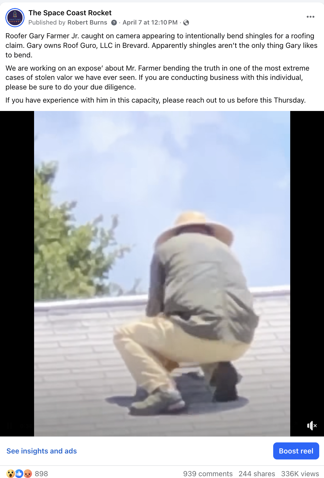 We introduced Gary Alden to our followers via a now Facebook video post which shows Farmer on top of a customer’s roof in Titusville, Florida clearly creasing shingles in a manner consistent with fabricating wind damage according to the hundreds of roofers, adjusters, inspectors, and other experts who have commented and shared the post. As verified by Farmer himself, who repeatedly posted the business card of the detective involved int he case, it is a current and open criminal investigation. Since then, other individuals and organizations have come forward and are initiating investigations.