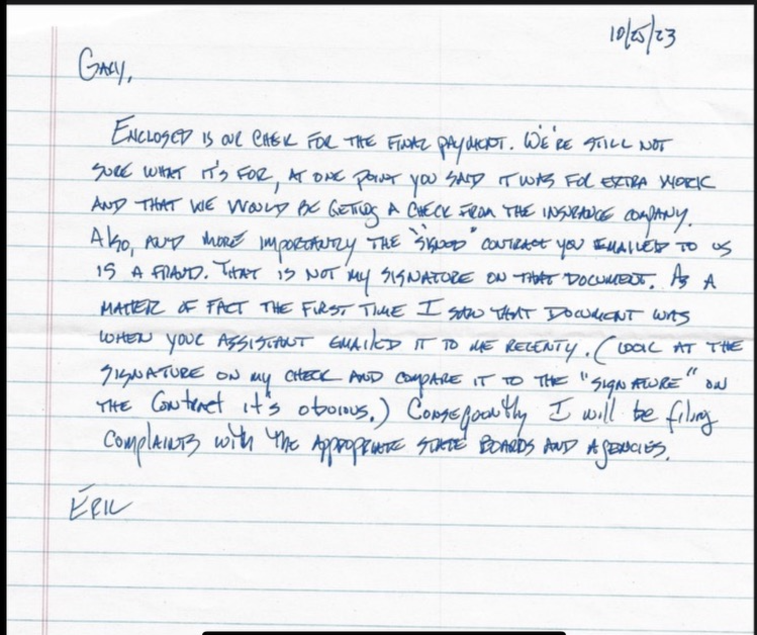 “Also, and more importantly, the ‘signed’ contract you emailed to us is a fraud. That is not my signature on that document. As a matter of fact the first time I saw that document was when your assistant emailed it to me recently. (Look at the signature on my check and compare it to the ‘signature’ on the contract — it’s obvious.) Consequently, I will be filing complaints with the appropriate state boards and agencies.”