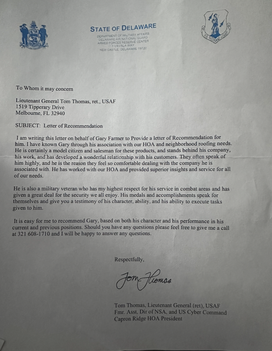 Among the most audacious elements of Farmer’s fraud was his acquisition of a letter of recommendation from Lieutenant General (Ret.) Tom Thomas, a decorated senior military officer. The letter speaks to Farmer’s character and reliability in a professional context. What the general did not know — and what Farmer deliberately concealed — is that the military service record he used to establish a connection with General Thomas was entirely fictitious. The letter was obtained through deception and has been used to further legitimize Farmer’s fraudulent persona.