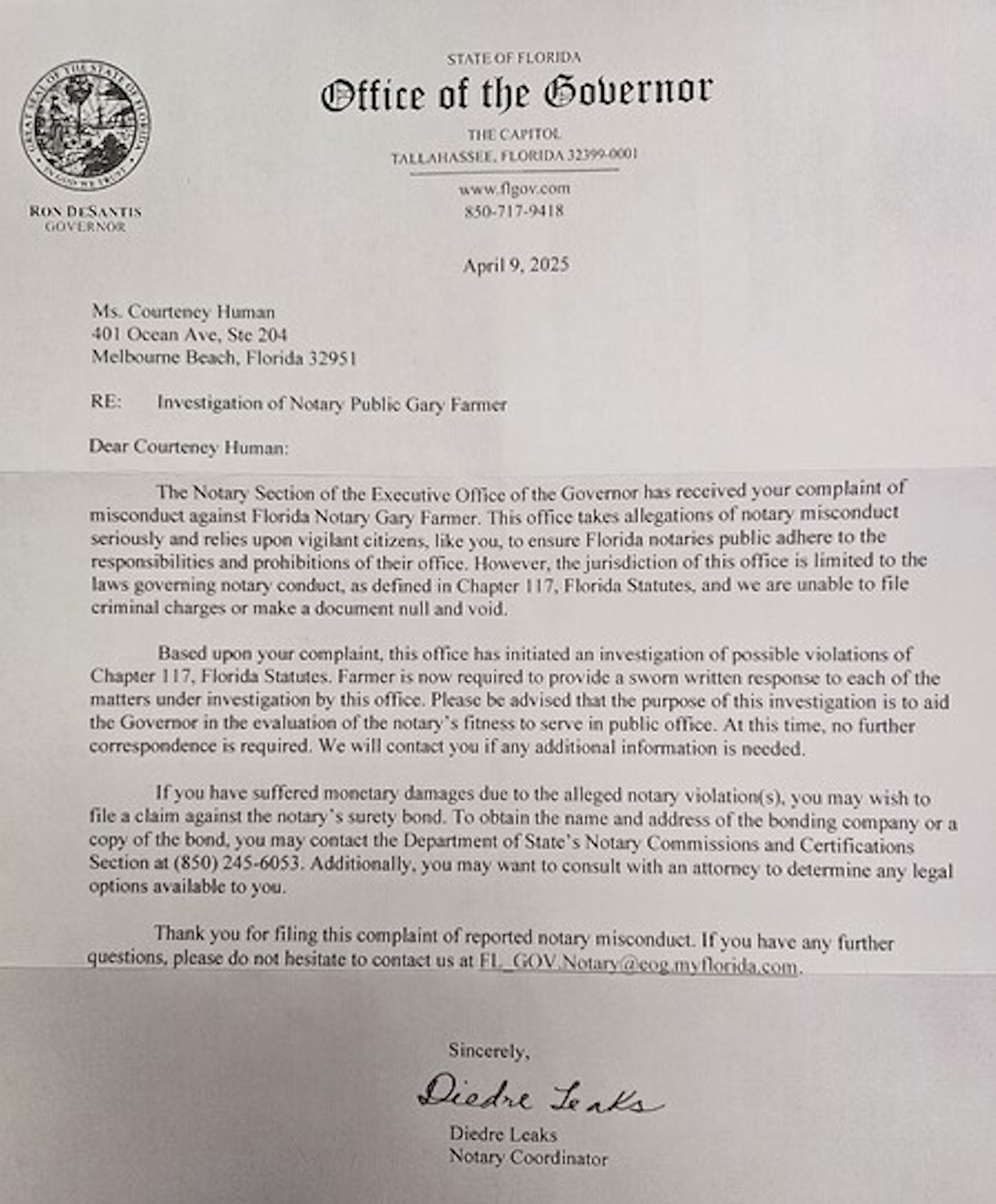 Florida Governor’s office notary correspondence — investigation into Farmer’s commission status