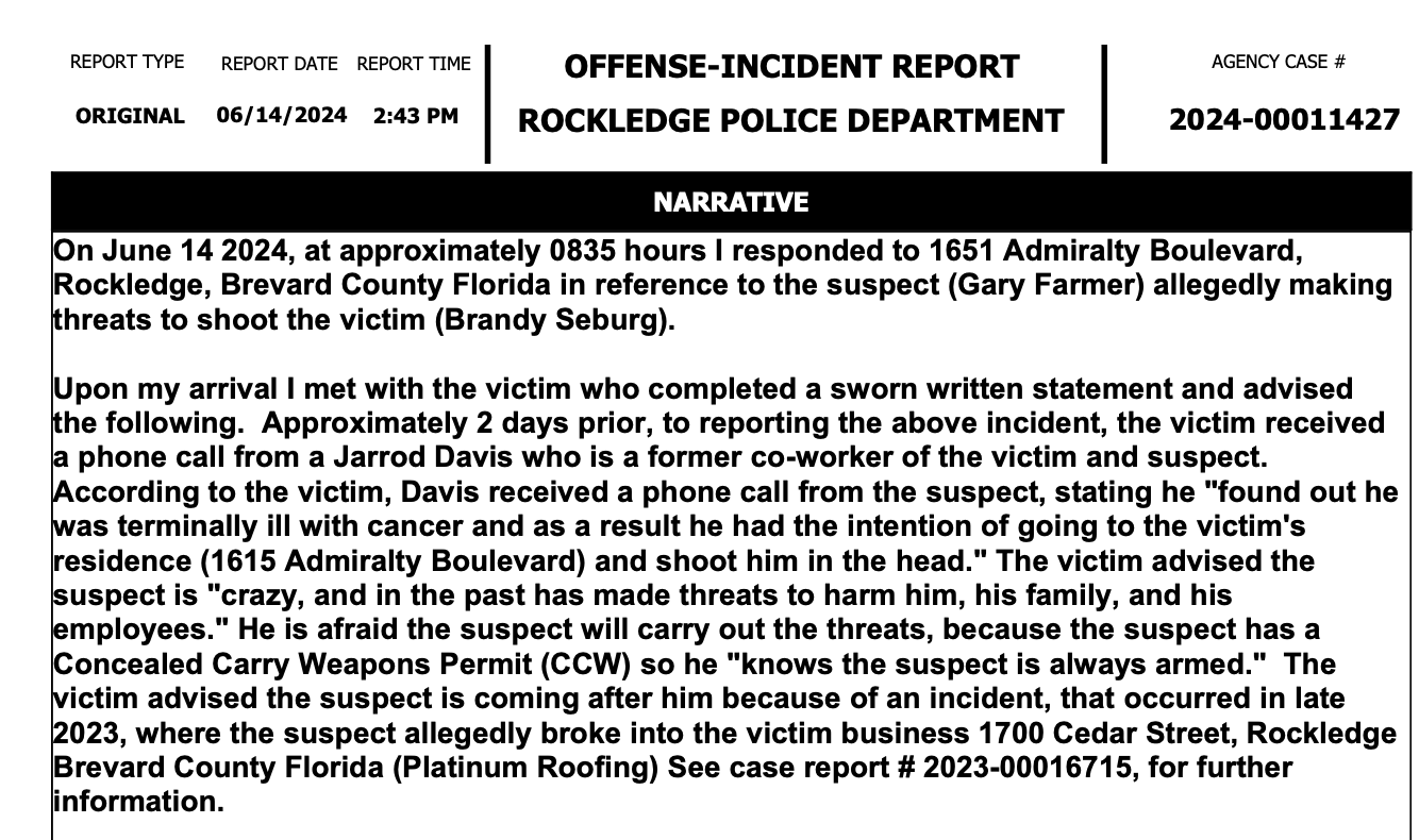 Among the police reports provided by sources is one documenting a specific perceived threat made by Farmer to a former domestic partner. The June 2024 Rockledge Police report records a threat to shoot the victim. Farmer, according to the report, invoked a reference to the TV show Breaking Bad — specifically the method used in that show to dispose of a human body using lye — in a direct threat against the partner. No charges were filed in the case.