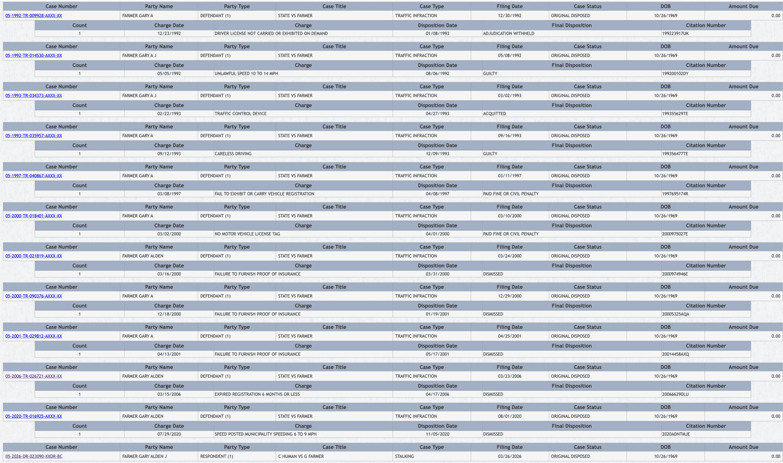 The most recent non-traffic case in that court record is Case No. 05-2026-DR-023090-XXDR-BC — C. Human vs. G. Farmer — filed March 26, 2026, for stalking. This case is addressed in Part IV of this report.