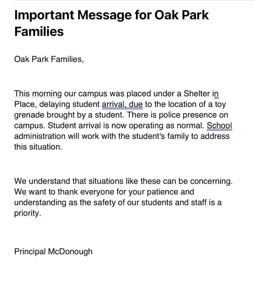 Principal McDonough of Oak Park School addressed the incident in a letter to families, emphasizing the swift action taken by law enforcement and school staff to ensure the safety of students and personnel. “This morning our campus was placed under a Shelter in Place, delaying student arrival due to the discovery of a toy grenade brought by a student. The situation is now resolved, and student arrival has resumed as normal,” stated McDonough.