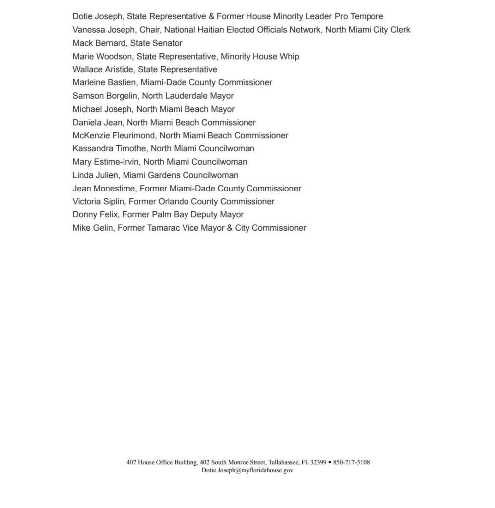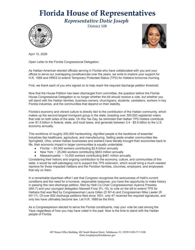 “Florida’s Haitian community is a cornerstone of our state’s economy, culture, and identity,” Joseph said in a statement accompanying the letter.