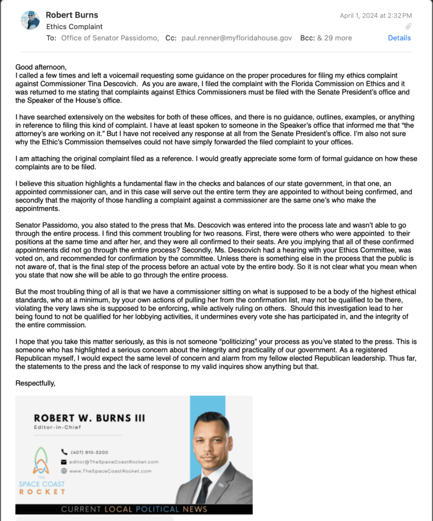 On February 28, 2024, Burns filed a formal complaint with the Florida Commission on Ethics detailing how Descovich’s paid leadership role at Moms for Liberty constituted unregistered lobbying under Florida law. His complaint outlined clear, documented violations — showing that Descovich not only actively worked to influence legislation but also financially benefited from political action committees while judging cases before the very Ethics Commission she served on.