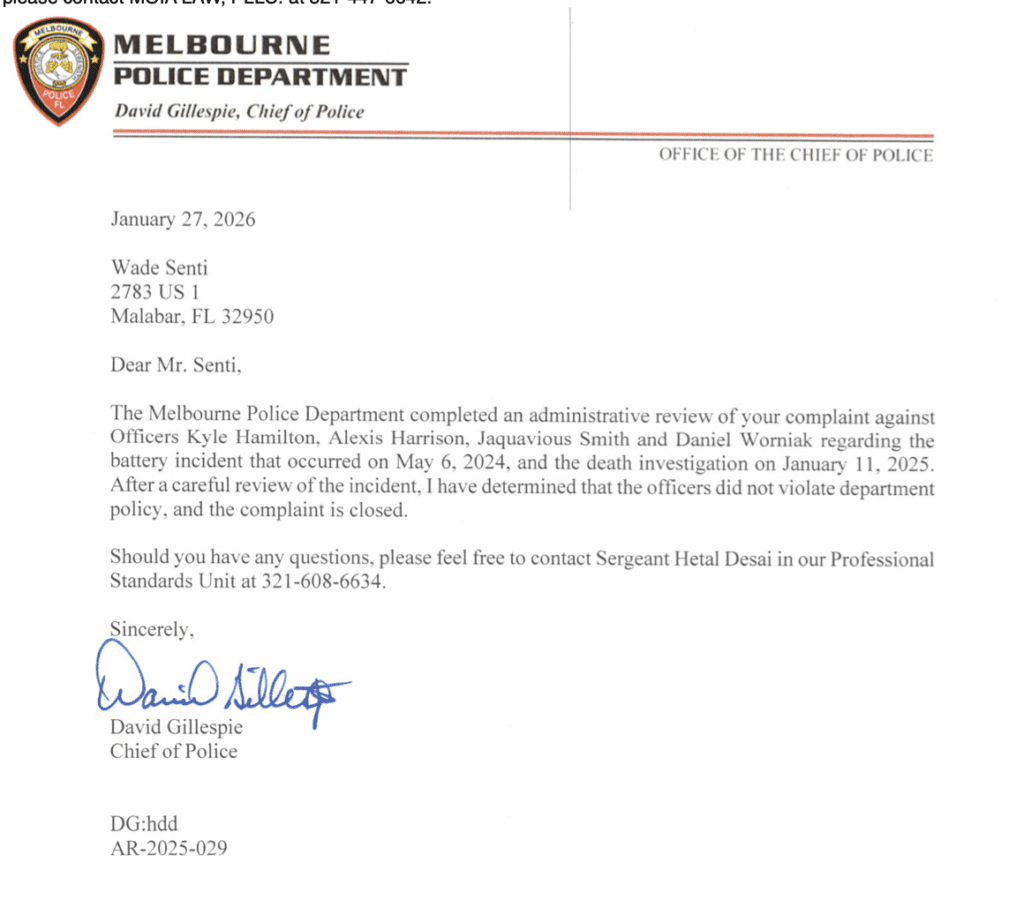 In a January 27, 2026 letter, Melbourne Police Chief David Gillespie reported an internal review found no policy violations by the officers involved. The family disputes that conclusion and argues it does not resolve what they see as inconsistencies in the case documentation.