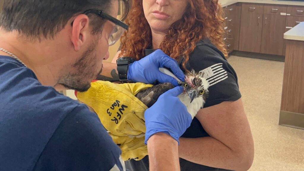 The rescue began when Lexi, who was working at the front desk at Jetty Park, received a visitor carrying an injured osprey. The bird was in distress—one hook embedded near its eye and the other in its right talon, forcing it into a bent position. Acting quickly, Lexi covered the bird with a rain jacket to keep it calm and contacted Adriane with Wild Florida Rescue (WFR).