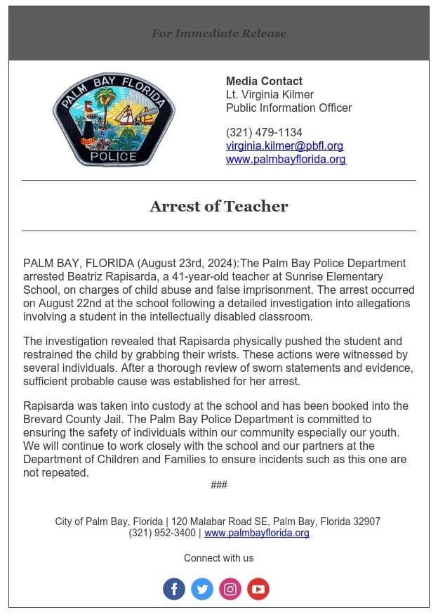 Palm Bay, FL – A teacher for intellectually disabled students has been arrested on charges of child abuse and false imprisonment following disturbing allegations of physical abuse against one of her students. The teacher, Beatriz Rapisarda, was taken into custody on August 22, 2024, after an investigation by the Palm Bay Police Department, in conjunction with the Department of Children and Families (DCF).