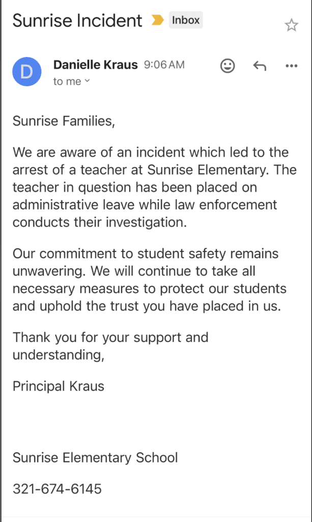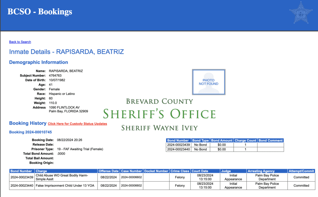 The student’s parents, upon being informed of the incidents, expressed their intent to pursue criminal charges against the teacher. When approached by law enforcement, Rapisarda declined to provide a statement without legal representation. She was subsequently arrested and charged with one count of child abuse under Florida Statute 827.03(b)(1) and one count of false imprisonment under Florida Statute 787.02(1)(b).