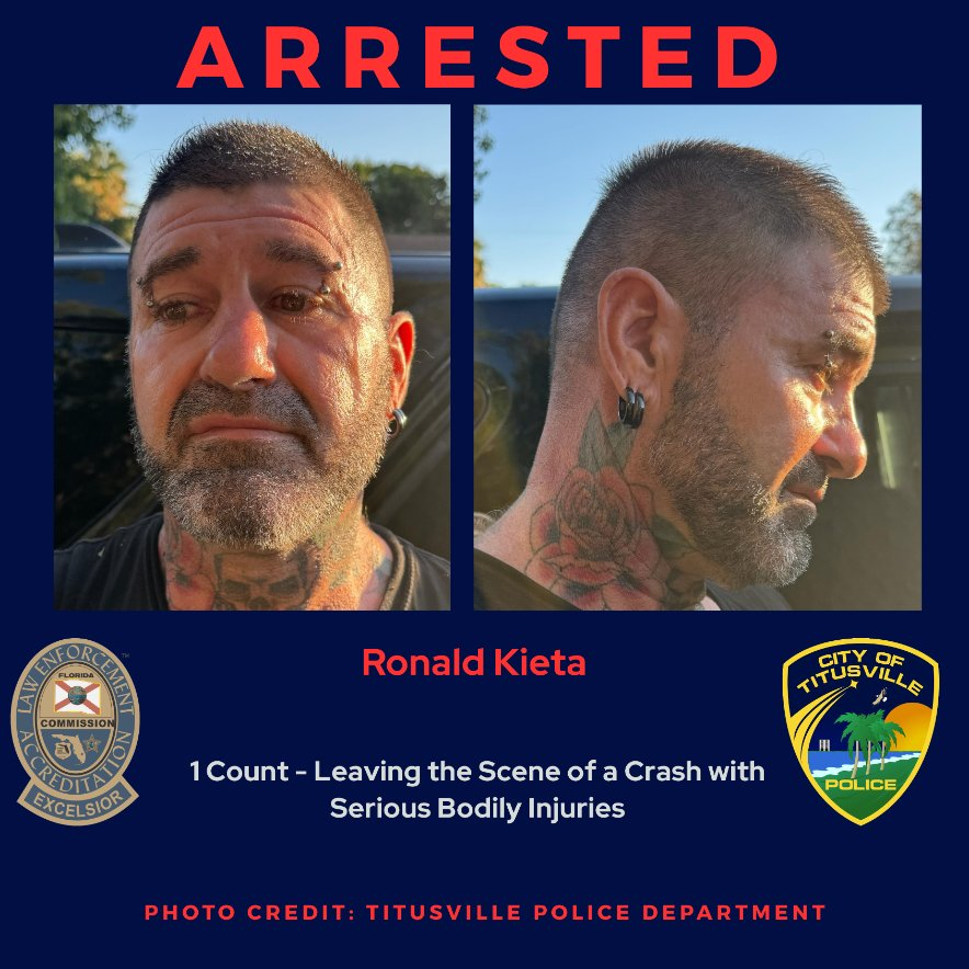 On November 14, 2025, Ronald Kieta was arrested without incident and transported to the Brevard County Jail where he is being held on a NO BOND STATUS. Kieta was charged with 1 count of Leaving the scene of a crash with serious bodily injuries.