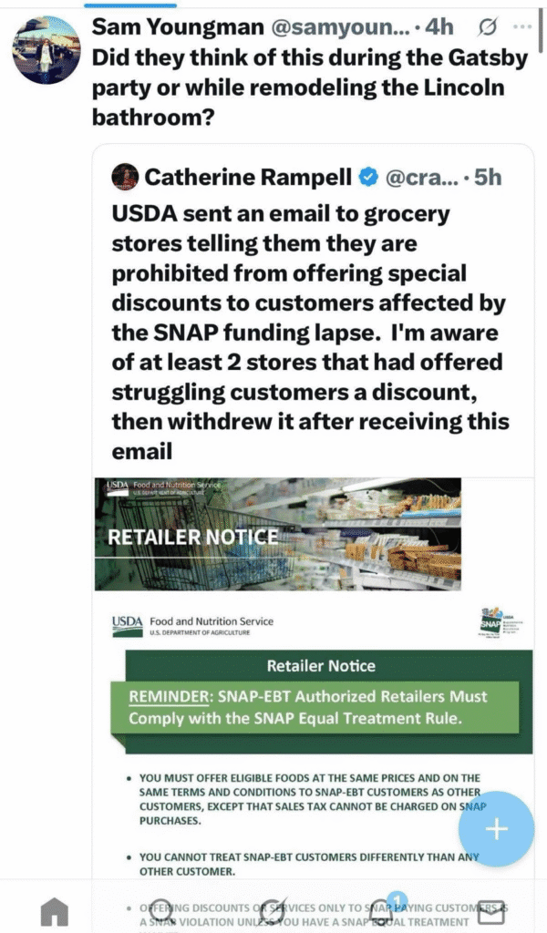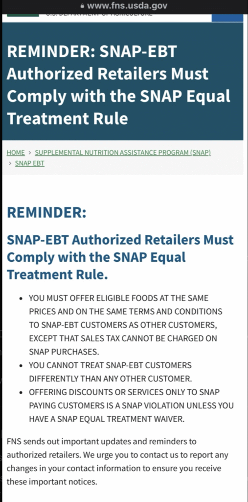 The agency’s message cites the federal “Equal Treatment Rule” — a regulation found in 7 C.F.R. § 278.2(b) — which requires retailers that accept EBT to treat SNAP customers “exactly the same” as cash or credit customers. That means no special prices, no exclusive coupons, and no targeted discounts, even if those discounts are meant to help struggling families buy food.